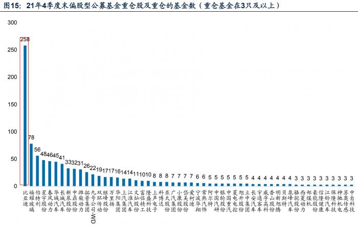 从偏股型公募基金重仓股数量来看,2021年4季度末,偏股型公募基金重仓数量前10的汽车行业个股(及重仓基金数)分别为:比亚迪(258)、福耀玻璃(78)、伯特利(56)、星宇股份(48)、春风动力(46)、华域汽车(45)、长城汽车(41)、新泉股份(33)、中鼎股份(32)、潍柴动力(31)。