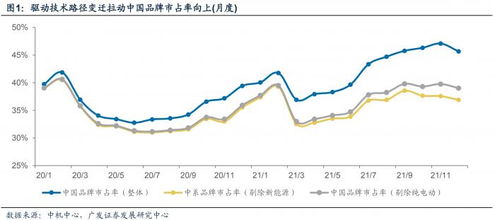 驱动技术路径的变迁对中国品牌份额拉动显著。根据中机中心,中国品牌2021年12月乘用车市占率为45.7%,同比增长6.2%;剔除新能源后中国品牌市占率为36.9%,同比增长1.3%。新能源拉动中国品牌市占率提升8.8%,其中纯电动拉动提升7.0%。