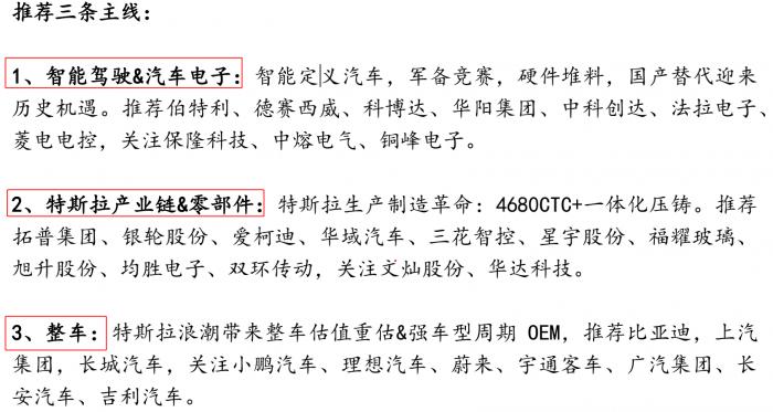 国海证券推荐关注汽车板块智能驾驶&汽车电子、特斯拉产业链&零部件、整车三条主线相关投资机会。