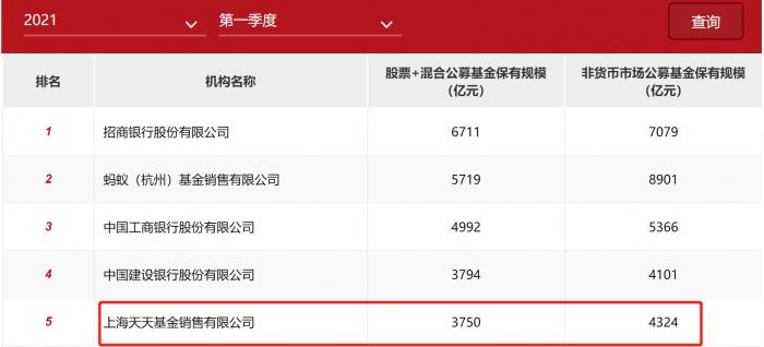 2021年1季度末,在基金业协会公布的100家机构代销公募的保有规模与排名中,天天基金还排在第五位。排在其前面的分别是招商银行、蚂蚁基金、工商银行、建设银行。
