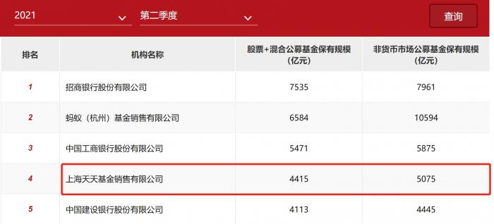 结果到了2021年2季度末,天天基金的两项代销指标,均超过了建设银行,跻身行业第四。
