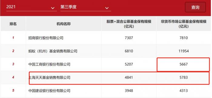 随后到了2021年3季度末,大家发现,尽管天天基金的“股票+混合”公募保有规模还少于工商银行,只能排在行业第四,但其非货基保有规模则已经超过了工商银行。这时候,天天基金的“股票+混合”公募保有规模是4841亿元,工商银行是5207亿元,前者比后者少了366亿元;但天天基金的非货基保有规模是5783亿元,工商银行是5667亿元,前者比后者多了116亿元。