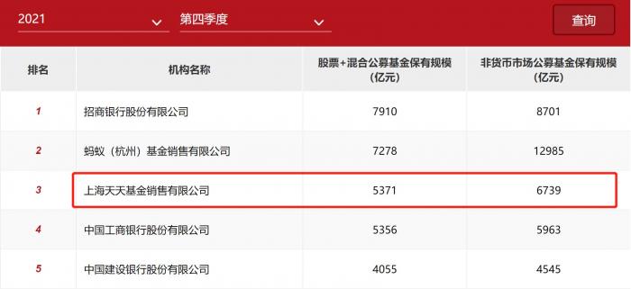 以股票+混合公募基金保有规模计,排名前三的分别是招商银行(7910亿元)、蚂蚁基金(7278亿元)、天天基金(5371亿元)。继去年3季度天天基金的非货基保有规模超越工行后,4季度,天天基金在股票+混合公募基金的保有规模排名上,也超越了工行。