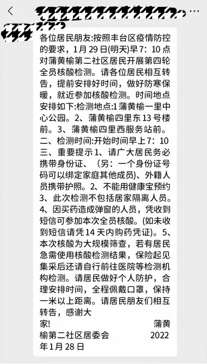 蒲黄榆第二社区第四轮全员核酸检测通知 受访者供图