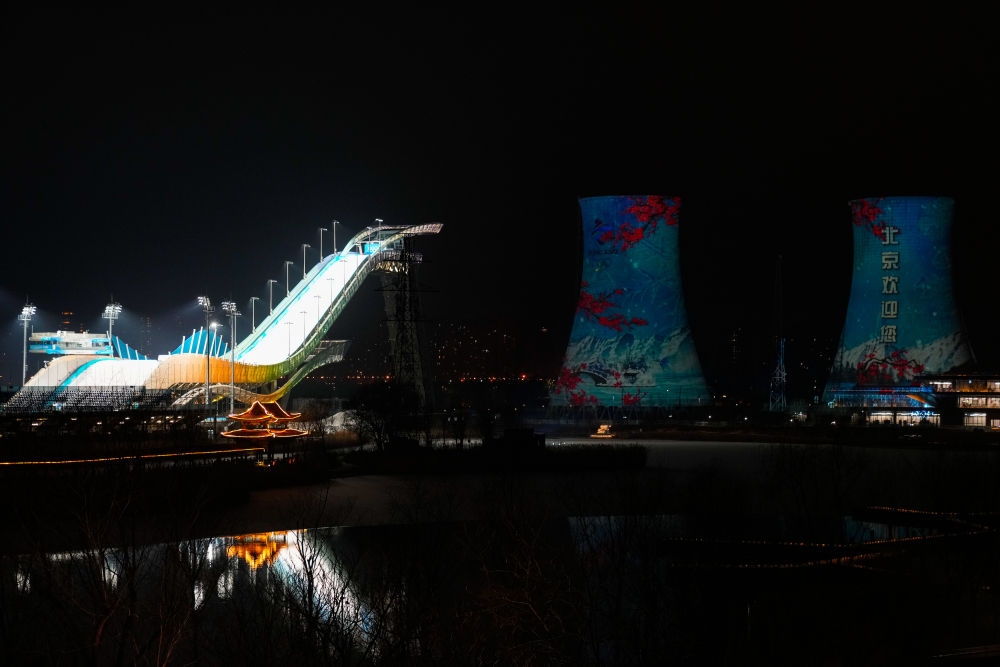1月20日,位于北京市石景山区首钢园内的首钢滑雪大跳台开启灯光秀。新华社记者彭子洋摄
