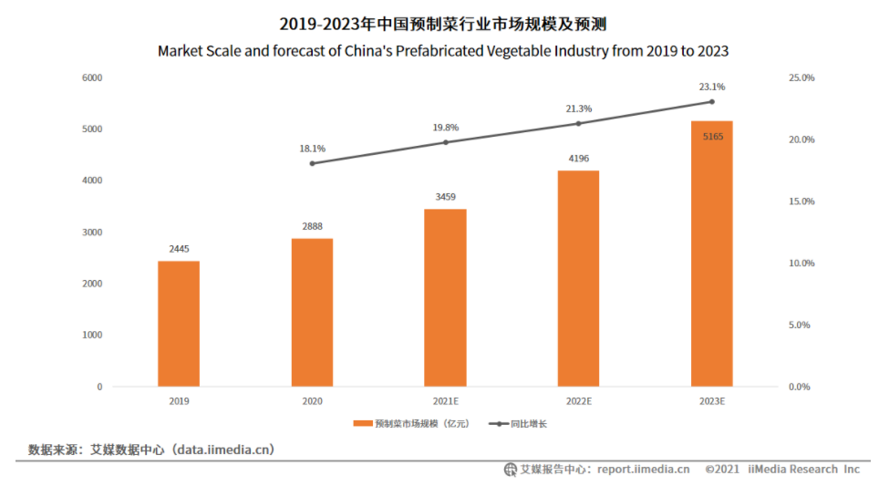 艾媒研究院发布的《2021年中国预制菜行业分析报告》(以下简称“《报告》”)指出,2021年中国预制菜市场规模预估为3459亿元,同比增长18.1%。随着消费升级以及冷链物流布局,预制菜市场将向BC端同时加速发展,之后将以20%的增长率逐年上升,2023年中国预制菜规模将达5165亿元。