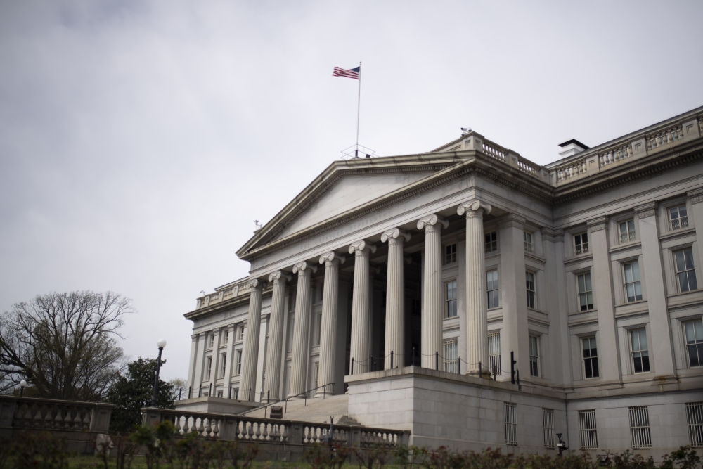 这是2020年3月27日在美国首都华盛顿拍摄的美国财政部大楼。(新华社记者刘杰摄)