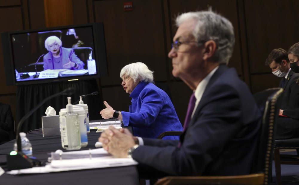 2021年9月28日,美国财政部长耶伦(左一)在华盛顿出席国会参议院银行、住房和城市事务委员会听证会。(新华社发,Pool图片/凯文·迪奇摄)