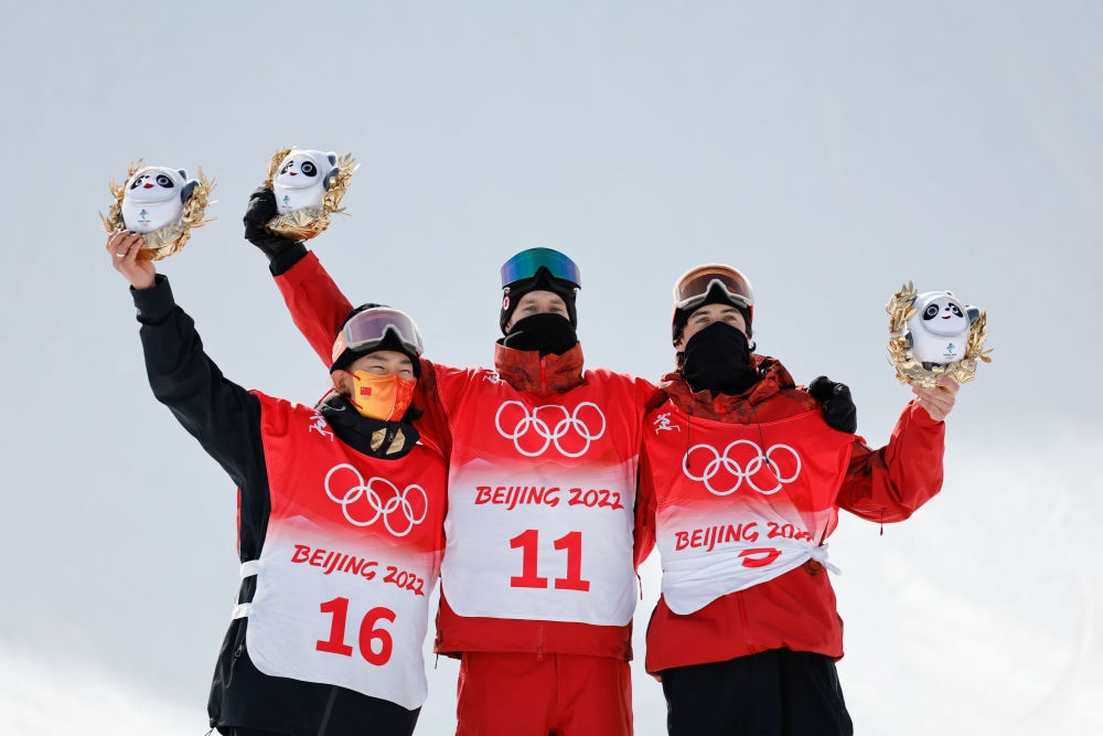 2月7日,获得冠军的加拿大选手马克斯·帕罗特(中),获得亚军的中国选手苏翊鸣(左)和获得季军的加拿大选手马克·麦克莫里斯在颁发纪念品仪式上。新华社记者 费茂华 摄