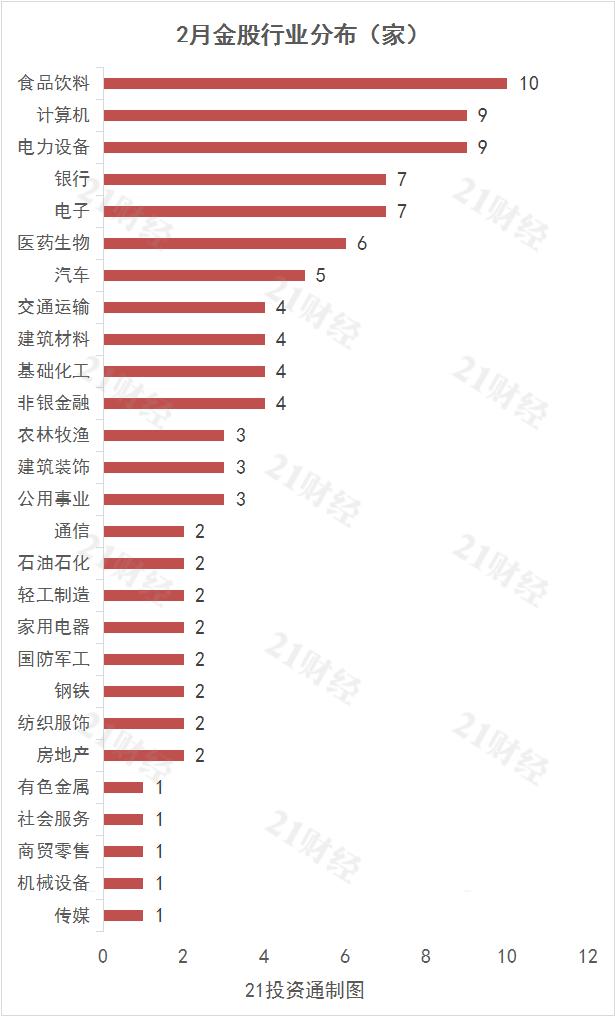 从金股的行业分布来看,食品饮料位居第一,共有10家公司被推荐,计算机和电力设备紧随其后,均9家公司被推荐。