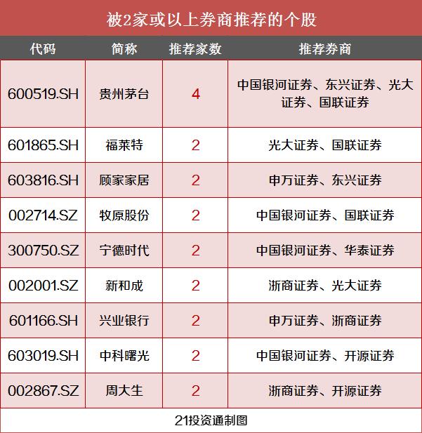 其中,“白酒龙头”贵州茅台(600519.SH)获4家券商推荐。公司近期取消拆箱政策、增加直营比重、新增经销商配额量等政策逐渐落地。