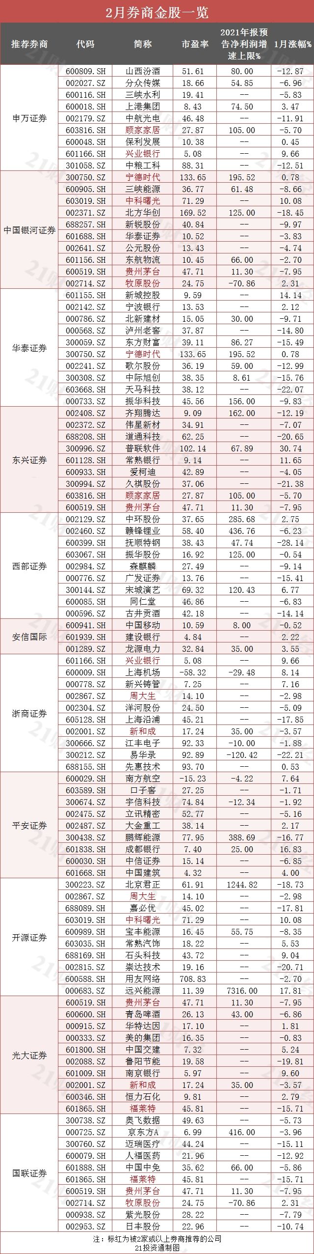 据21投资通(微信号ID:touzit21)不完全统计,截至2月6日,已有11家券商公布了2月金股,共有88只金股获得推荐。