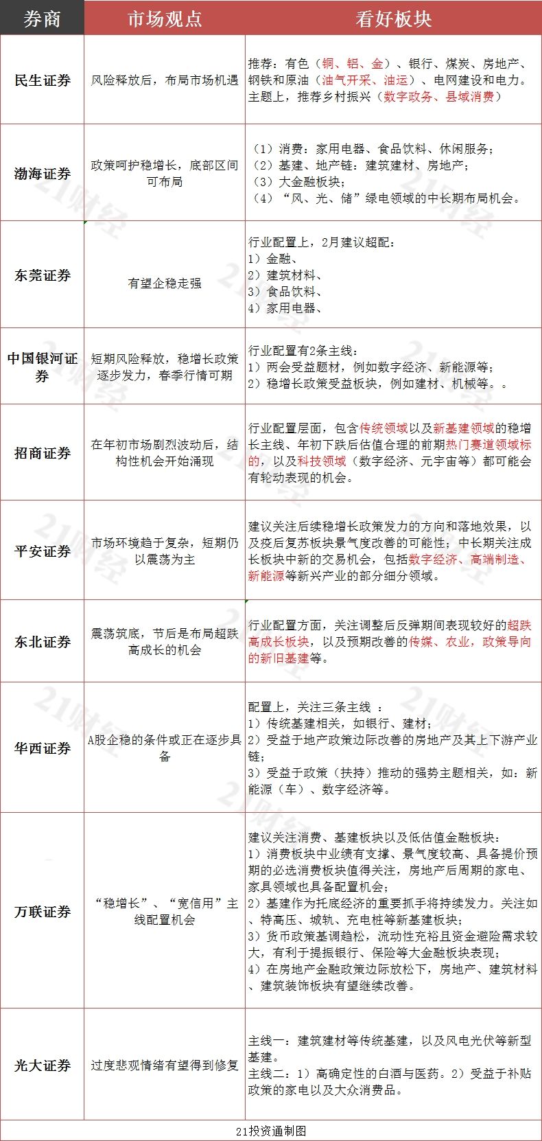 对于节后A股行情,券商普遍认为A股有望反弹,待投资者情绪企稳、部分赛道风险逐步释放后,稳增长带动的春季行情或将逐步开启。