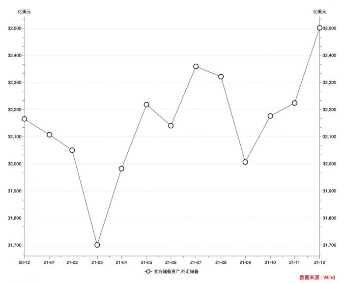 其中,外汇储备规模在2021年9月、10月、11月、12月分别是32006.26亿美元、32176.14亿美元、32223.86亿美元、32501.66亿美元,环比分别增长-314.9亿美元、168.99亿美元、47.72亿美元、277.80亿美元。