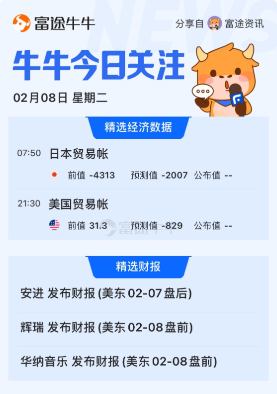 财报方面,安进(AMGN.US)于美东时间2月7日盘后公布财报,辉瑞(PFE.US)、华纳音乐(WMG.US)将于美东时间2月8日美股盘前发布最新业绩。