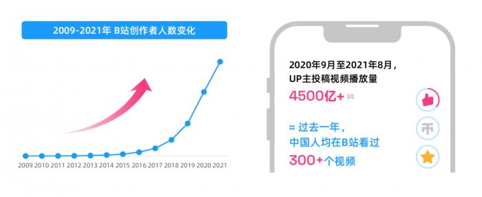 此外,B站上传内容数还在高速增长。B站发布放入《2021 创作者生态报告》显示,月均活跃 UP 主达 270 万人,同比增长 61%;月投稿量突破 1000 万份,同比增长 80%。