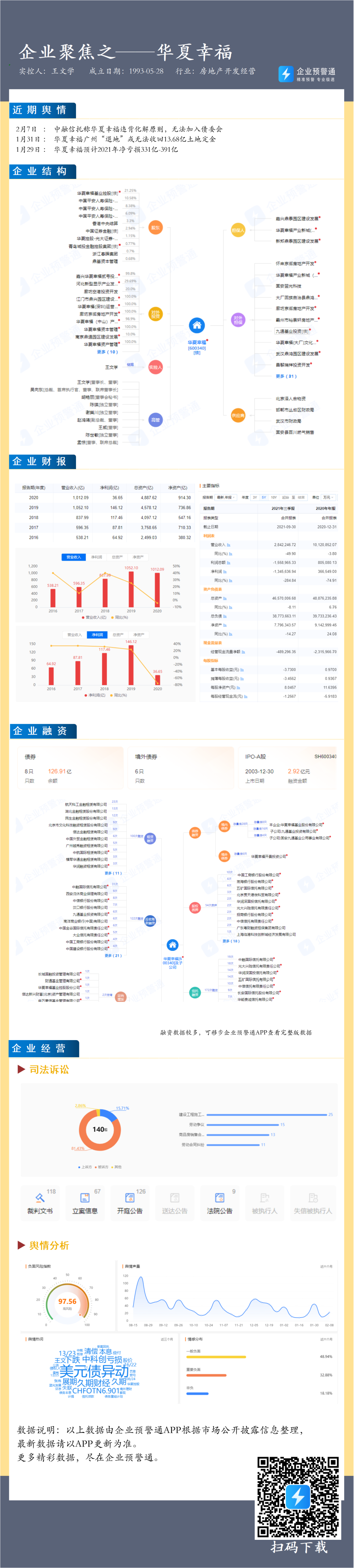 此前,华夏幸福发布2021年年度业绩预告,公告显示,预计公司2021年实现归属于上市公司股东的净利润为-331亿元到-391亿元,对于本期业绩预亏的主要原因,华夏幸福解释为受宏观经济、行业环境、信用环境叠加多轮疫情影响,公司流动性自2020年第四季度以来出现阶段性紧张,公司出现金融债务未能如期偿还的情况,融资业务几乎停滞,对公司经营产生严重影响,导致公司的业绩大幅下降。