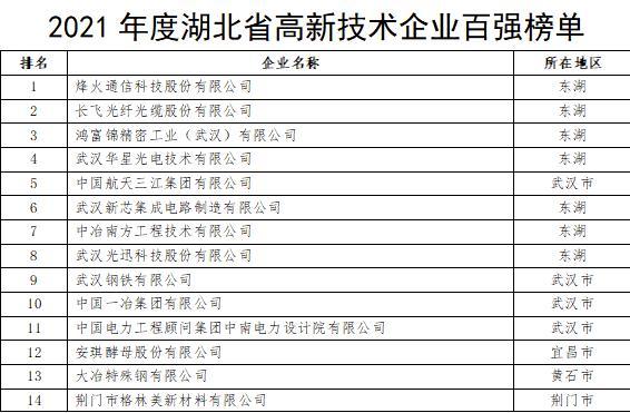 2021年度湖北省高新技术企业百强榜单出炉