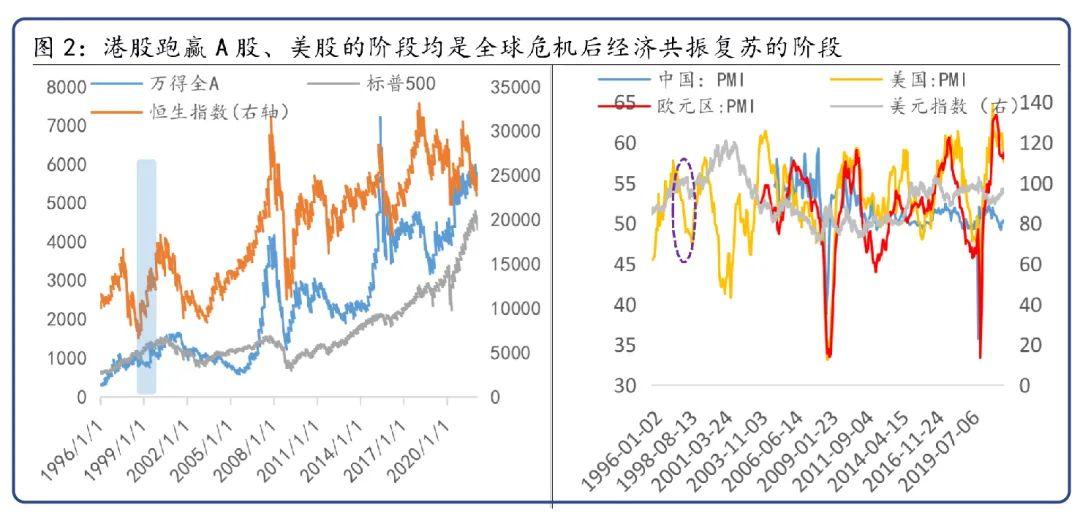 历史上,港股同时跑赢美股和A股的概率较低,但仅有的6次跑赢基本上发生在危机后全球经济共振修复阶段,基本面强与美元弱的组合或许是核心催化。在此阶段,主要经济体的PMI共振向上,美元处在弱势区间,港股受益于基本面修复和流动性的扩张弹性更大。