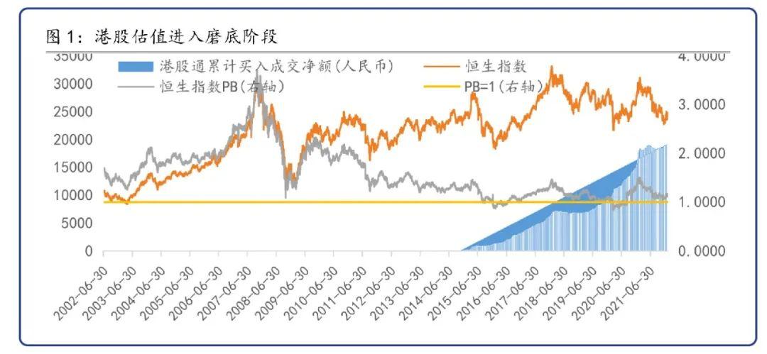 相对于全球股票市场估值的“高企”,港股在经历了2020年和2021年大幅回撤后估值基本回到历史底部区域。从历史来看,恒生指数PB在1附近预示着港股进入了“磨底”,在当下紧缩预期加强的阶段,“估值低”成为了天然的“避风港”。无独有偶,南下资金在2021年12月和2022年1月重回大幅净流入,港股通分别净买入408亿元和358亿元。