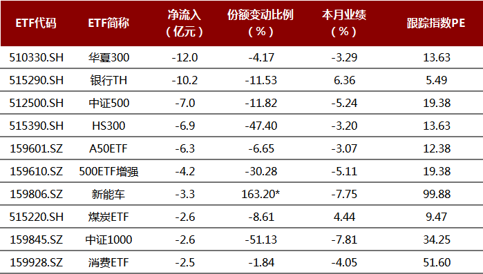 资金净流出居前的为华夏300、银行TH、中证500、HS300、A50ETF,流出金额相对较小。此外,次新基金500ETF增强本月有较大比例的资金赎回。