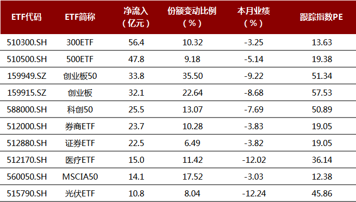 资金净流入居前的为300、500、创业板50、创业板、科创50、券商、医药等ETF,资金逢低买入宽基指数和超跌板块。