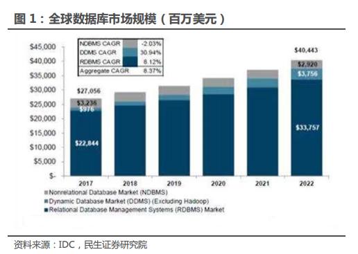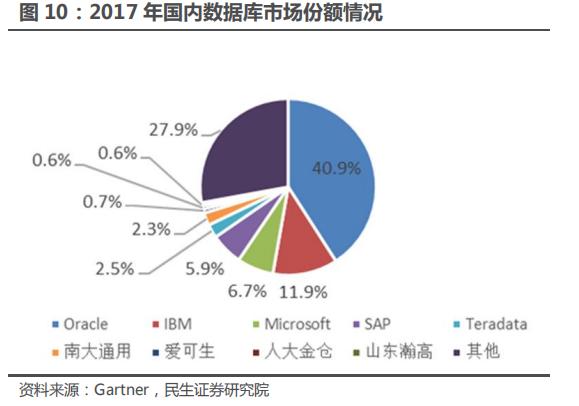 考虑到Oracle在国内市场所占有的份额稳定在40%-50%,民生证券基于以上数据进行测算,国内数据库市场规模或将达到300-400亿元/年。