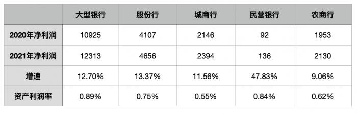 主要指标分机构类情况表揭示了不同类型银行的净利润情况,据21世纪经济报道记者测算,2021年大型银行、股份行、城商行、民营银行、农商行净利润增速分别为12.70%、13.37%、11.56%、47.83%、9.06%。而从资产利润率看,仅大型银行、民营银行高于行业平均值。
