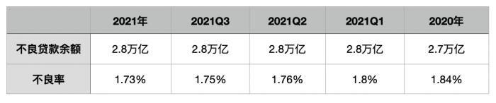 银保监会数据显示,截至2021年四季度末商业银行不良贷款余额2.8万亿元,较上季末增加135亿元;商业银行不良贷款率1.73%,较上季末下降0.02个百分点。从全年来看,2021年商业银行不良贷款率呈逐季下降趋势,但不良贷款余额仍在提升,截至2021年四季度末为28470亿元。