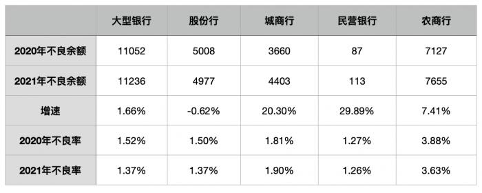 不过,具体到不同类型银行的资产质量表现情况差异较大。据21世纪经济报道记者测算,2021年大型银行、股份行、城商行、民营银行、农商行不良贷款余额较2020年增速分别为1.66%、-0.62%、20.30%、29.89%、7.41%;而从不良率来看,仅城商行较2020年有所提升,至1.90%,农商行不良率持续保持高位为3.63%,民营银行得益于贷款规模增速较快,不良率微降至1.26%。