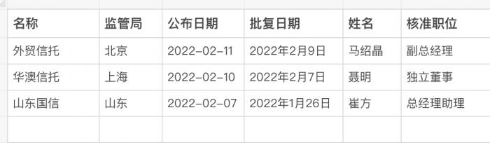 上周,以银保监官网公布日期为口径,有3家信托公司的董高监任职资格获批,包括:山东国信总经理助理崔方、华澳信托独立董事聂明、外贸信托副总经理马绍晶。