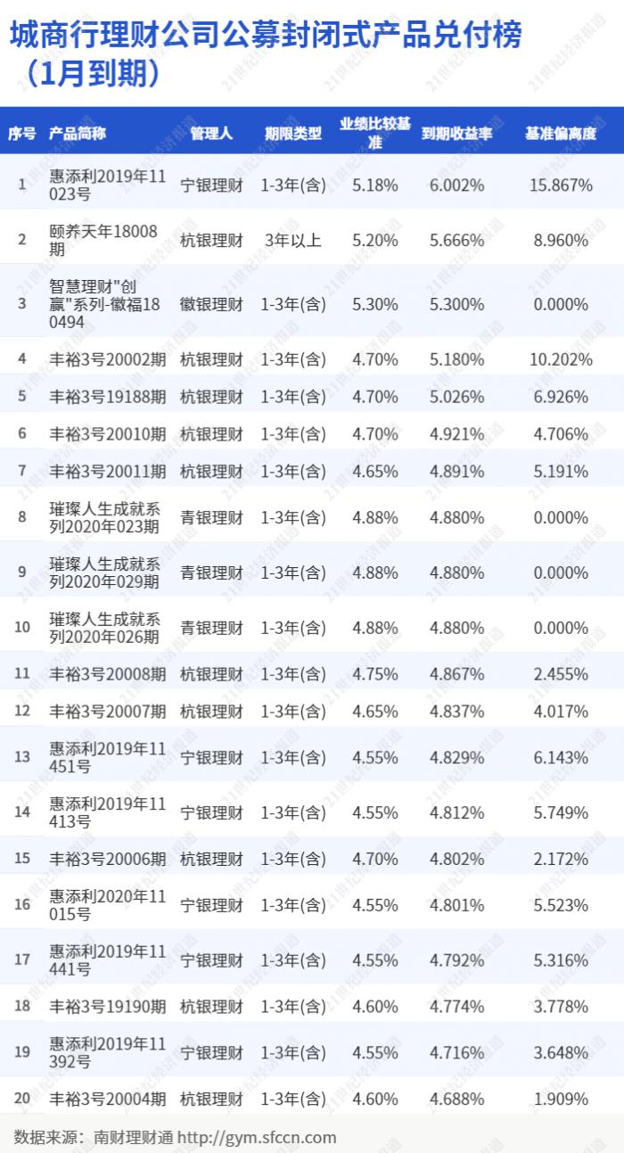 【理财兑付榜】城商行理财公司公募封闭式产品到期收益率