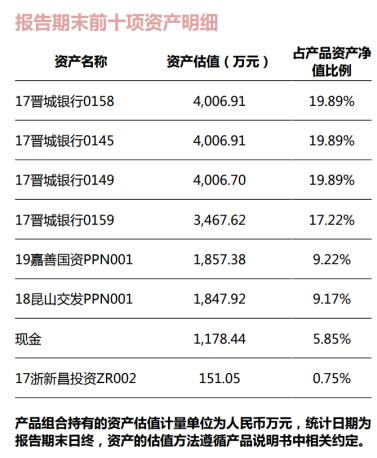 该产品第五大持仓、第六大持仓均为私募城投债,其中第五大持仓“19嘉善国资PPN001”,资产估值1857.38万元,占产品资产净值比例9.22%。债券票面利率为4.73%,剩余期限1.95年。第六大持仓18昆山交发PPN001,发行票息6.15%,剩余期限1.19年。