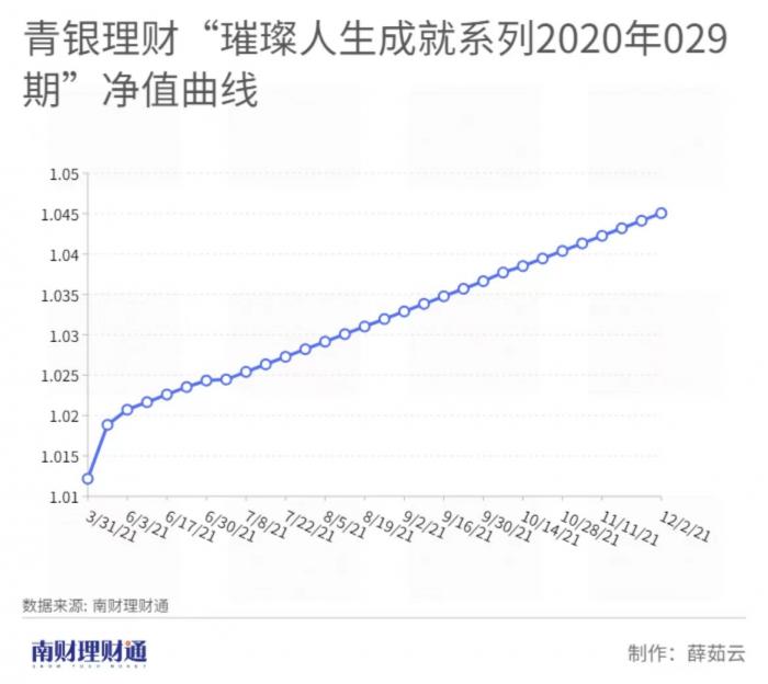 值得注意的是,青银理财和徽银理财两家理财公司的部分产品到期收益率与业绩比较基准完全一致。以青银理财“璀璨人生成就系列2020年029期”为例,该产品自2021年3月31日进入封闭期起,产品净值在短时间内出现大幅攀升,于5月20日达1.019,而后进入稳定增长阶段,净值曲线近似呈一条直线。