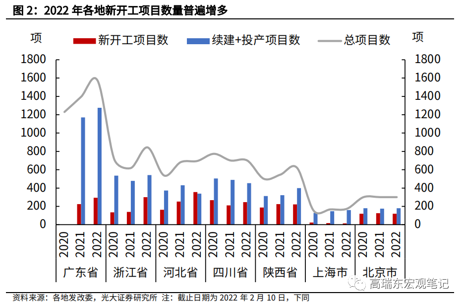 从1月以来,北京、上海、广东、浙江、江苏、河北、山东、四川、陕西等9个省份公布2022年重大项目建设计划,推动一季度重大项目集中开工。时点较往年提前1-2个月,并且着重强化落地导向,可见地方政府稳增长的紧迫性明显提升。