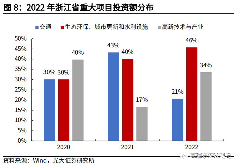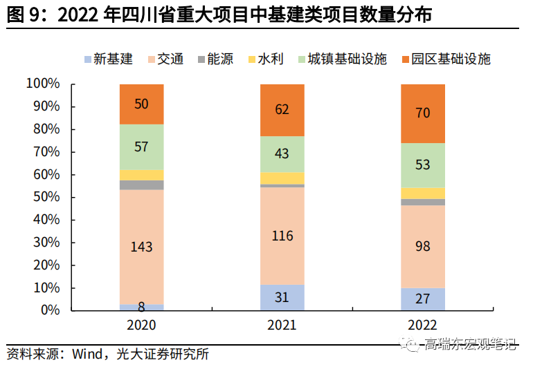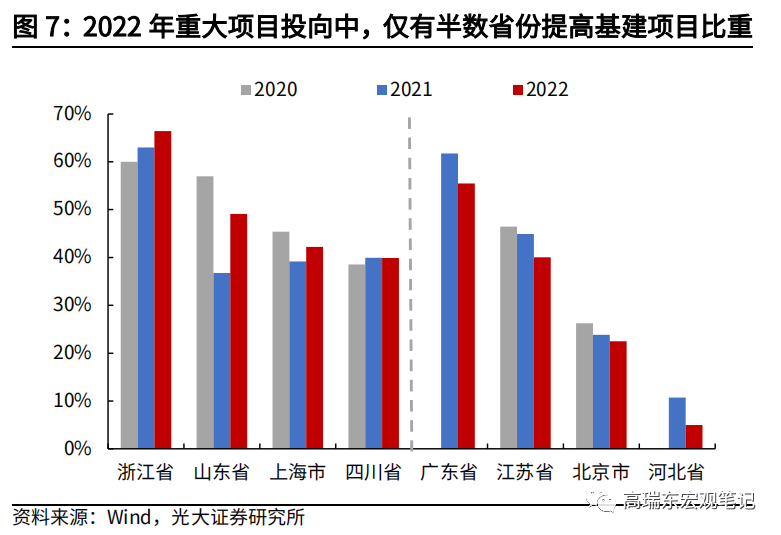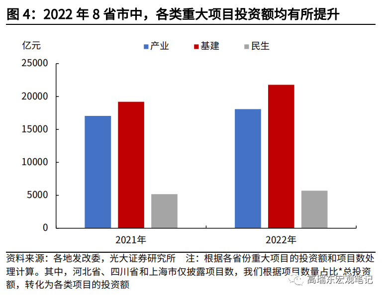 2022年各地重大项目仍然是以产业和基建为主,整体投向基建的比重有所抬升。上述9个省份中,有8个省份披露具体项目投资额或数量,我们将其归纳为产业、基建、民生三类。其中,投向基建比例自2021年的46%提高至48%,投向产业比例自2021年的41%小幅回落至40%。