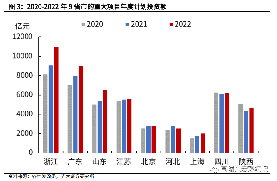 2022年,上述9大省市的重大项目年度计划投资额达5万亿,较2021年增长10%,高于2021年6%的计划增速。东部地区中,浙江、广东、山东投资规模居前,2022年重大项目计划投资分别为10972亿元、9000亿元、6500亿元,较2021年均多出1000亿元以上。西部地区中,陕西、四川的投资规模也呈现较快增长,扭转2021年重大项目投资规模回落的趋势。