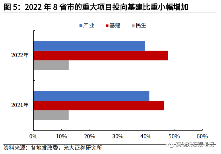 2022年各地重大项目仍然是以产业和基建为主,整体投向基建的比重小幅抬升。但各地普遍加大产业投资力度,而基建集中发力的特征更加显著。观察2022年8个省市的重大项目投向,有6个省份投向产业的比重持平或高于2021年,而仅有4个省份投向基建比重持平或高于2021年。