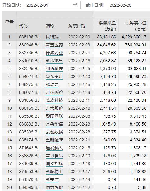 Wind数据显示,2022年2月共有20家北交所上市公司合计10.14亿股限售股解禁,以2月16日收盘价计算,解禁总市值达531.20亿元。