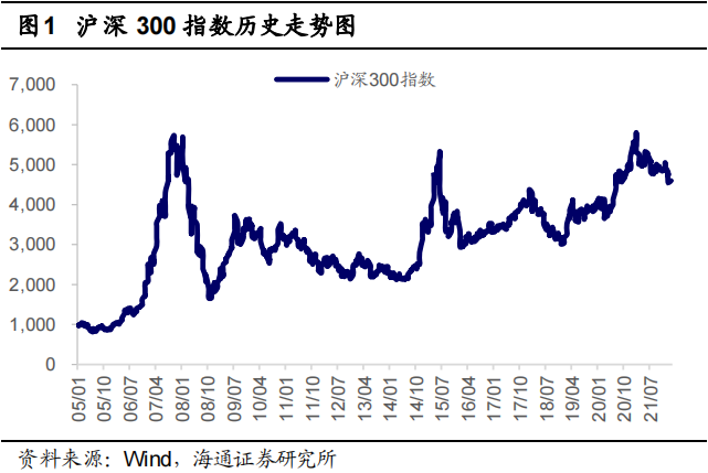 今年以来市场迎来大幅调整,有人担心市场会不会步入熊市?我们早在2021年度策略报告《曲则全,枉则直——2022年中国资本市场展望-20211211》就提出2022年定性为震荡市,目前我们仍认为今年市场不会是熊市,维持震荡格局判断。在此,我们回顾2005年以来,沪深300已经历了4轮完整周期性波动,具体涨跌时空详见表1。通过对比历史来看,我们来看看当前沪深300调整的时间和空间到底如何,具体如下: