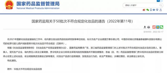 2月17日,国家药监局发布关于50批次不符合规定化妆品的通告(2022年第11号)。