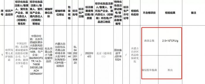 如德国进口的哈罗闪婴儿柔护润肤霜被检出铜绿假单胞菌。