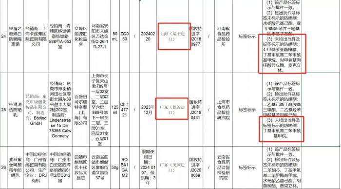 除哈罗闪外,还有多款进口防晒霜未检验出批件及标签标示的防晒剂。