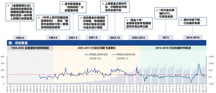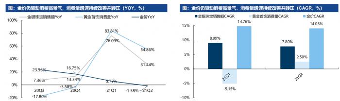 2020年下半年到2021年下半年,黄金消费持续景气,2020年下半年婚庆与投资需求作为主要因素推动了行业复苏,2021年,婚庆与投资需求影响弱化,供需共振下,古法金产品升级创造新的需求量,延续黄金消费高速增长的景气态势。