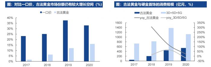 新工艺对传统黄金有替代作用,但同时也创造增量需求,古法金增长势头强劲。古法金、3D/5D/5G金等新工艺金饰为近年主要增量来源。