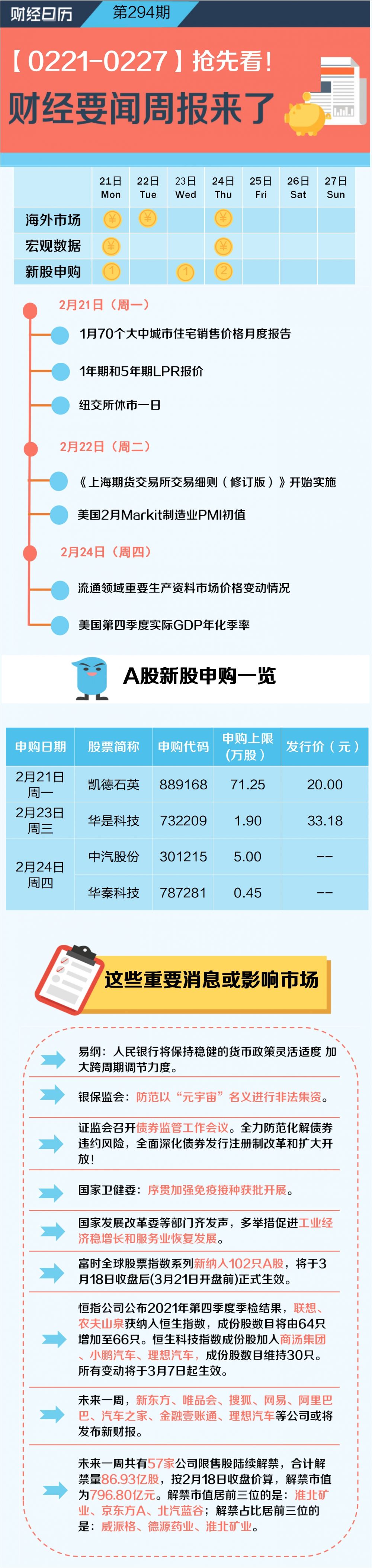周一,1年期和5年期LPR报价、1月70个大中城市住宅销售价格数据将公布;解禁股方面,淮北矿业、京东方A、北汽蓝谷居解禁市值前三位;威派格、德源药业、淮北矿业的解禁占比居前三位。对于后市,券商普遍认为市场将延续反弹,坚守稳增长主线。