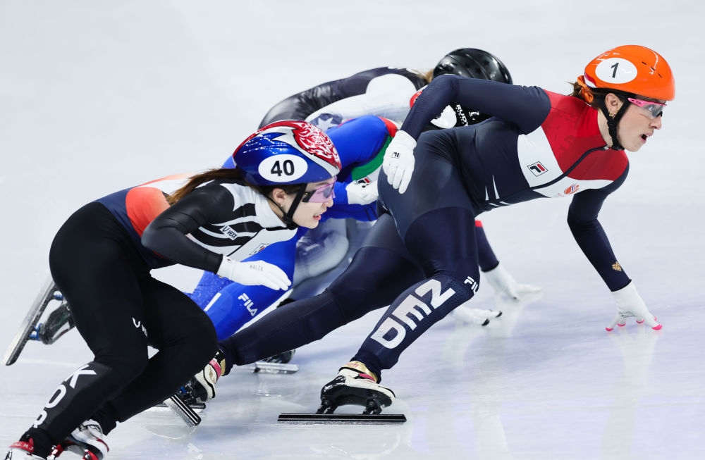 2月11日,荷兰队选手苏珊娜·舒尔廷(右一)在北京2022年冬奥会短道速滑项目女子1000米决赛中夺得冠军。新华社记者 兰红光 摄