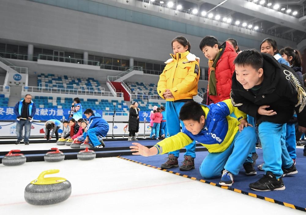 2019年12月10日,北京史家实验学校的学生在“冰立方”体验冰壶。新华社记者 鞠焕宗 摄