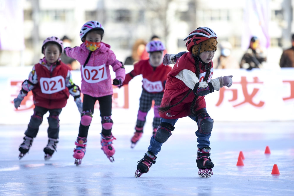 1月15日,小选手们在200米比赛中。当日,“喜迎冬奥 快乐运动”2022年宁夏银川市第四届青少年冬季冰雪运动会在湖滨体育场冰场举行。来自全市13个代表队的110多名选手参加比赛。新华社记者 冯开华 摄