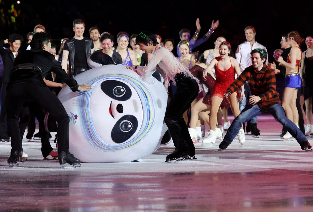2月20日,“冰墩墩”不小心摔倒后,选手们纷纷上前帮忙。当日,北京2022年冬奥会花样滑冰表演滑在首都体育馆举行。新华社记者 张玉薇 摄